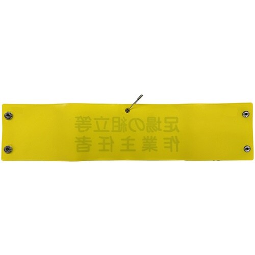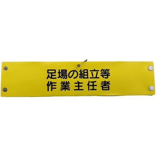 表示内容:足場の組立等作業主任者 | 色:黄 | 縦(mm):90 | 横(mm):400 | 取付方法:ホック、安全ピン | 材質・仕上げ:軟質塩化…