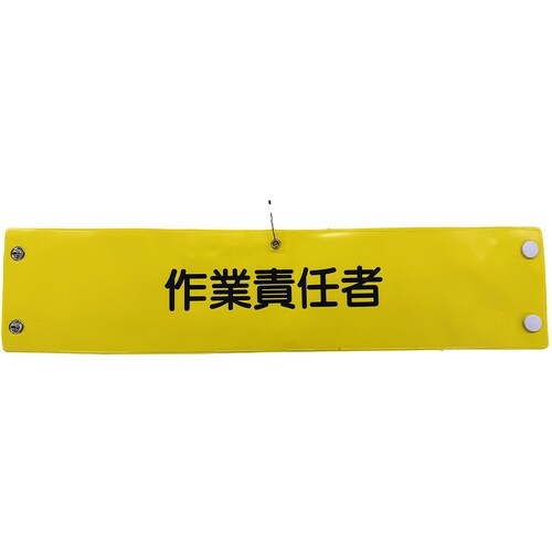 表示内容:作業責任者 | 色:黄 | 縦(mm):90 | 横(mm):400 | 取付方法:ホック、安全ピン | 材質・仕上げ:軟質塩化ビニール製 …