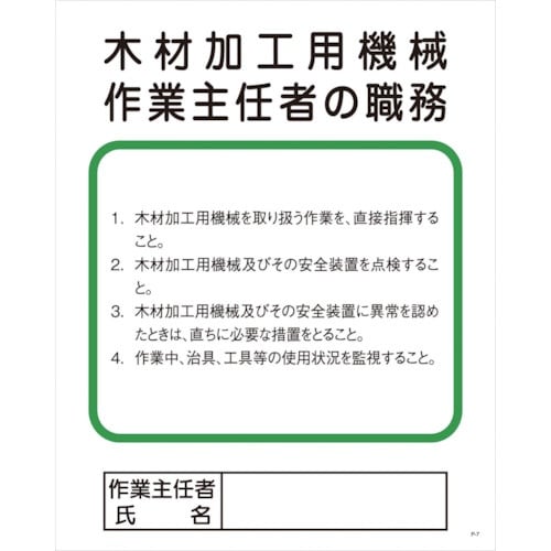 表示内容:木材加工用機械作業主任者の職務 | 取付仕様:ビス、インシュロック等(別売) | 縦(mm):500 | 横(mm):400 | 厚さ(mm…