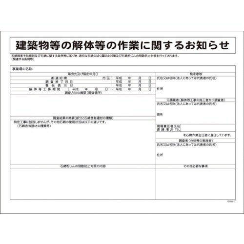 アスベスト(石綿)障害対策標識になります。現場に掲示する事で安全への意識向上になります。アスベスト(石綿)の対策に。 |