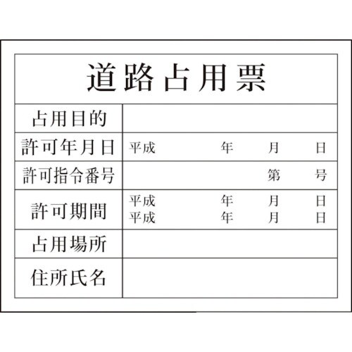 表示内容:道路占有票 | 取付仕様:ビスまたはテープ止め(ビス、テープ別売) | 縦(mm):400 | 横(mm):500 | 厚さ(mm):1 |…