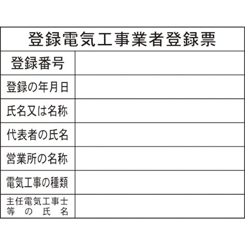 表示内容:登録電気工事業者登録票 | 取付仕様:ビスまたはテープ止め(ビス、テープ別売) | 縦(mm):400 | 横(mm):500 | 厚さ(m…
