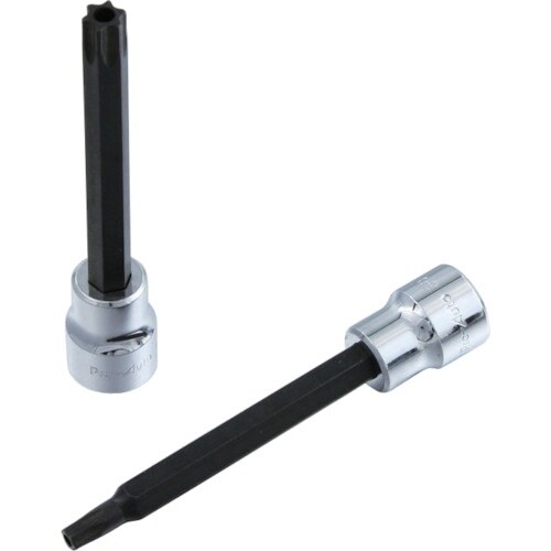 奥深いところでも使い勝手の良いロングタイプです。ラチェットハンドルやスピンナーハンドルと組み合わせて使用します。ヘックスローブねじの締め付け、緩め作業です。いじり止め対応穴付きです。