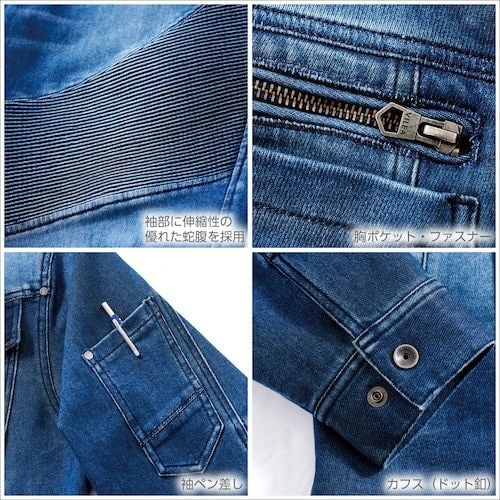 肘に優れた伸縮性蛇腹を採用。機能性に優れ、二重構造ソフトストレッチでアクティブに動けるデニムジャケット。軽作業に。アウトドアに。普段着に。作業着に。 |