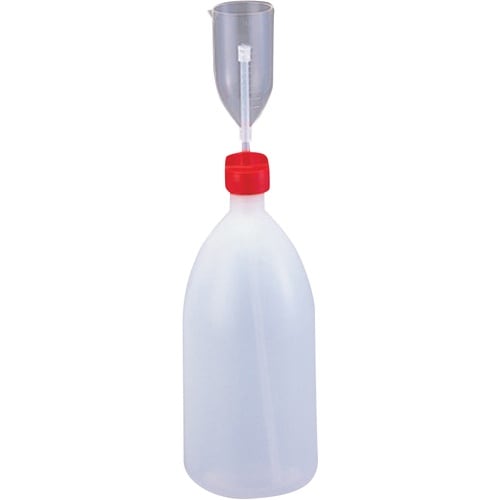 ワンタッチで秤量・分注できるボトルタイプの分注器です。分注パイプに目盛が付いており、カップを上下させて容量を設定します。 |