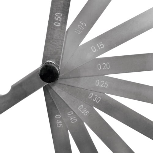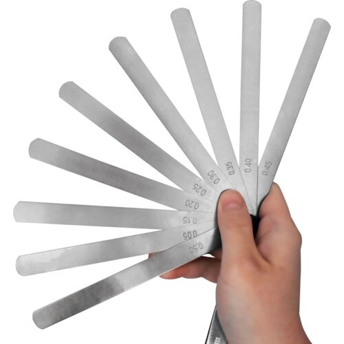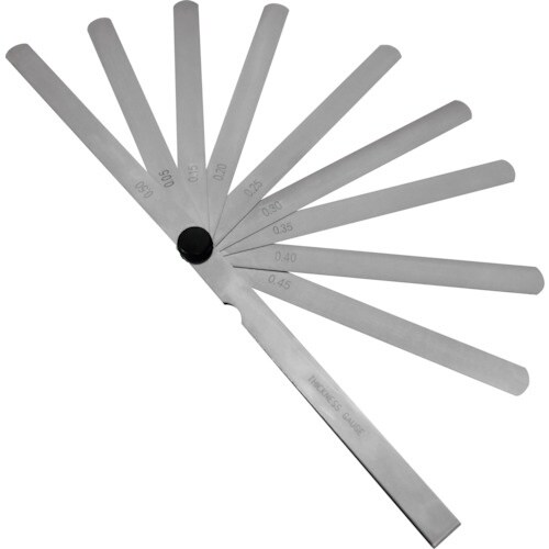 エンジンのバルブクリアランスなど、隙間の測定に使用する隙間ゲージです。対象の隙間に差し込んで計測します。リーフを重ねて使用することもできます。 |