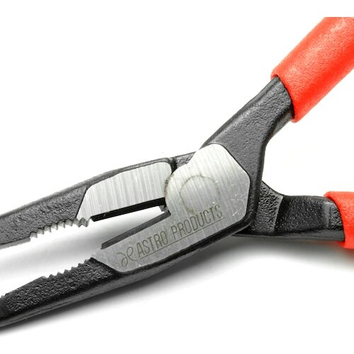 小さな物を挟む際や、狭い場所での使用に便利な、ストレートノーズプライヤーです。根元には、結束バンドや配線などのカットに役立つ、切断刃が付いています。 |