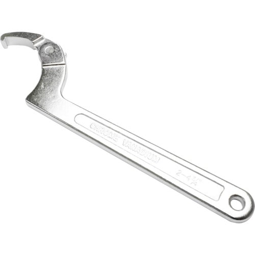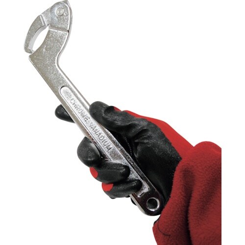 ロックナットの締緩やサスペンションの調整など、溝付きリングナットに対応する、アジャスタブルタイプのフックスパナです。無段階で、開口幅を調節できるので、様々なサイズに使用できます。 |