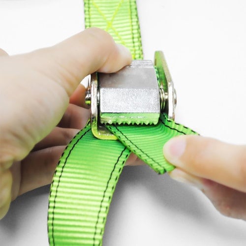 二輪車の積載や荷物の固定などに使用するタイダウンベルトです。カムバックル機構により、ベルトを引っ張るだけで対象物を固定することができまです。 |