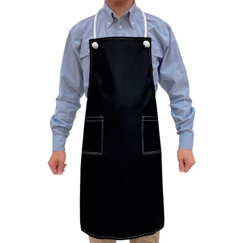 レザータッチの柔らかな風合いのビニールエプロンです。肩に食い込みにくい太い丸紐を使用しています。裏地(基布)レーヨン素材で肌にべとつかず優しい肌触りです。