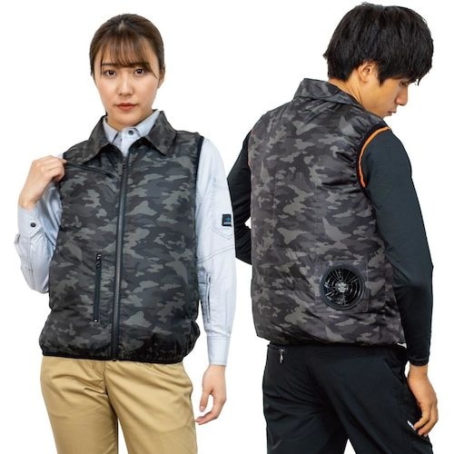 素材に極薄・超高密度ポリエステル100%の日本製生地を採用し、気密性を高めた迷彩柄のカジュアルな着心地のユニセックス仕様の空調ベストです。 |