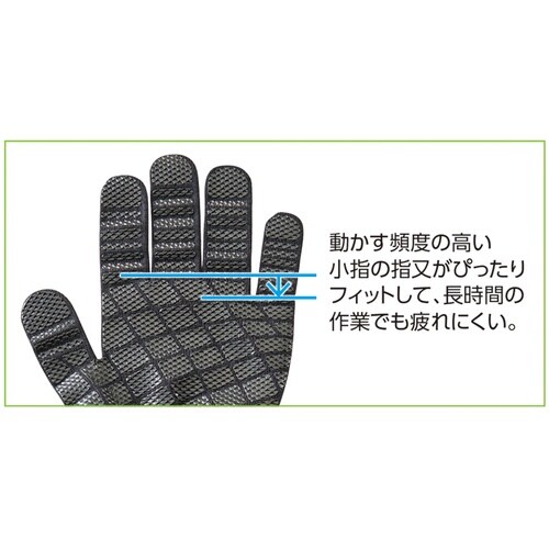 ブロック状の強力すべり止めでグリップ力MAXです。動かす頻度の高い小指の指又がぴったりフィットして、長時間の作業でも疲れにくいです。荷出し作業に。荷物の運搬に。園芸作業に。紙類の仕分けに。 |