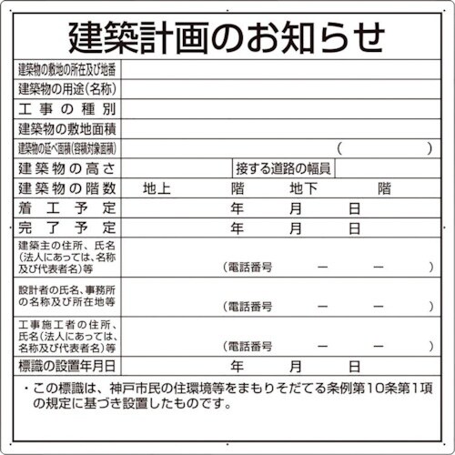 表示内容:建築計画のお知らせ(神戸市型) | 取付仕様:ビス止め | 縦(mm):900 | 横(mm):900 | 厚さ(mm):1.2 | タイプ…