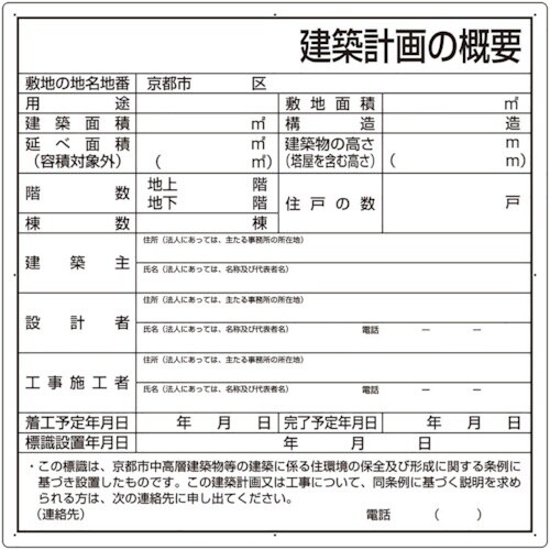 表示内容:建築計画の概要(京都市型) | 取付仕様:ビス止め | 縦(mm):900 | 横(mm):900 | 厚さ(mm):3 | タイプ:京都市…
