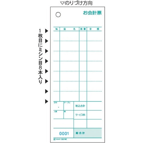 お会計票 70×175 2P ミシン入(3031)のナンバー入り・大入りタイプです。4ケタナンバー入りです。1枚目にミシン目8本入りです。複写のセットごとにのりづけしてあります。 |
