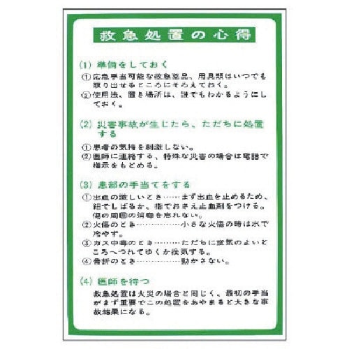 救急処置の心得を記載した標識です。工事現場、工場等での救急措置の心得を周知する表示に。 |