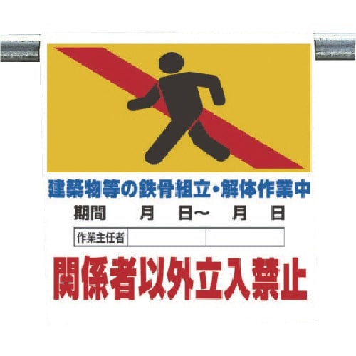 表示内容:建築物等の鉄骨組立・解体作業中 関係者以外立入禁止 | 取付仕様:裏面マジックテープ式 | 縦(mm):600 | 横(mm):450 | …