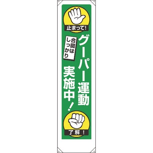 表示内容:止まって!合図はしっかり グーパー運動実施中! 了解! | 取付仕様:ヒモ止め | 縦(mm):1800 | 横(mm):450 | ハトメ…