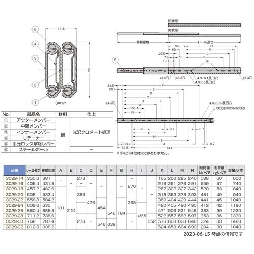 インナーメンバーを完全に引き出せる3段引のスライドレールです。レールを全開にすると、全開した状態で固定します。ロック解除レバーの操作で解除します。 |