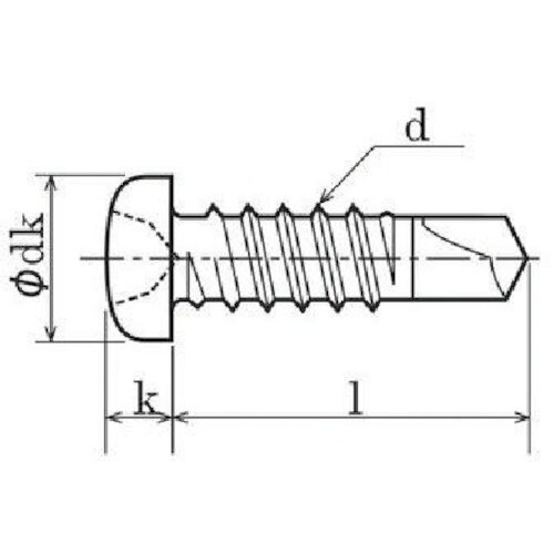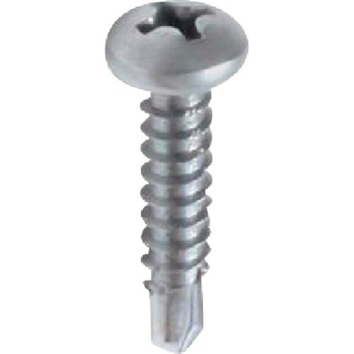 十字穴付のなべ頭タッピンねじで先端が切り刃になっています。この切り刃で下穴をあけ連動してタップ立て、締付けまでがねじ一本で出来ます。熱処理が必要ですのでSUS410を使用しています。 |