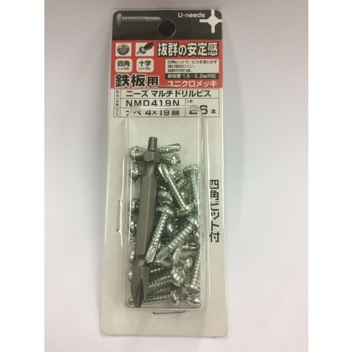 鉄板(SS400)の場合、1.5ー3.2mm厚まで下穴なしで一発貫通します。専用四角ビット付き。