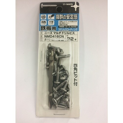 鉄板(SS400)の場合、1.5ー3.2mm厚まで下穴なしで一発貫通します。専用四角ビット付き。
