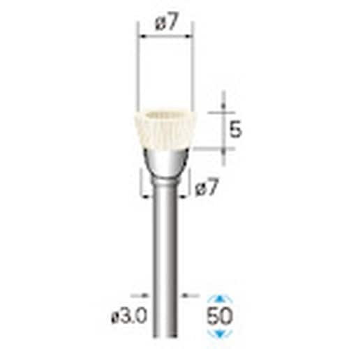 毛材:豚毛 | 外径(mm):7 | 毛丈(mm):5 | 軸径(mm):3 | 全長(mm):50 | 最高使用回転数(rpm):15000 | 形…
