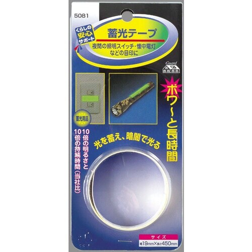| 注意事項 | ※残光時間は周囲の明るさ・光の強さ・距離などの諸条件によって左右され、輝度は時間の経過にともない低くなります。周囲の明るさにより発光を確認できる時間は異なります皮革製品に使用した場合、蓄光シートをはがす時に素材を傷めることがあります。織布・綿製品などの素材の柔らかい物には接着しにくい場合があります。軟質塩化ビニール素材には接着できません。 |