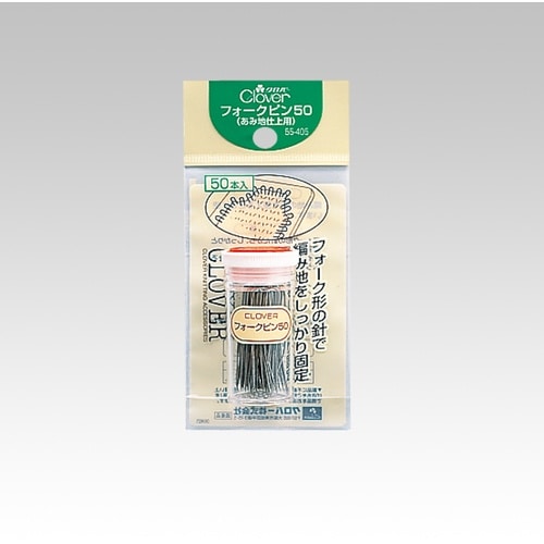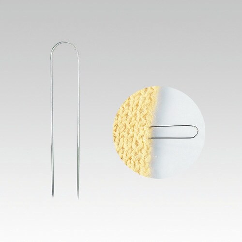 2本の針で、厚いあみ地もしっかり固定します。針軸が曲がったフォーク型のピンでアイロン掛けもスムーズです。 |