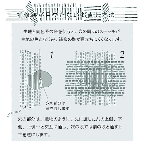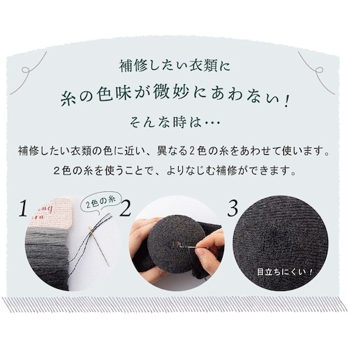 補修部分が目立たないようにお直しできます。ダーニングに適したウール調で細い糸です。ダーニングとは、ヨーロッパで伝統的に行われている、衣類の穴あきやすりきれた箇所を修繕する針仕事です。 |