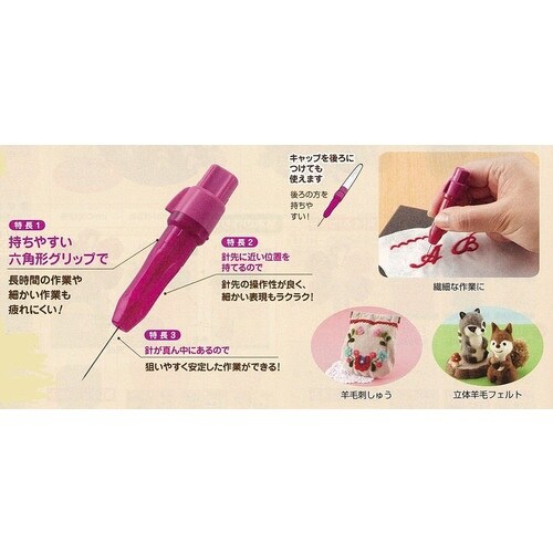 羊毛刺しゅうなど、繊細な作業にぴったりです。フェルトパンチャーは使いやすさや安全性にこだわった、羊毛フェルト手芸の専用ツールです。 |