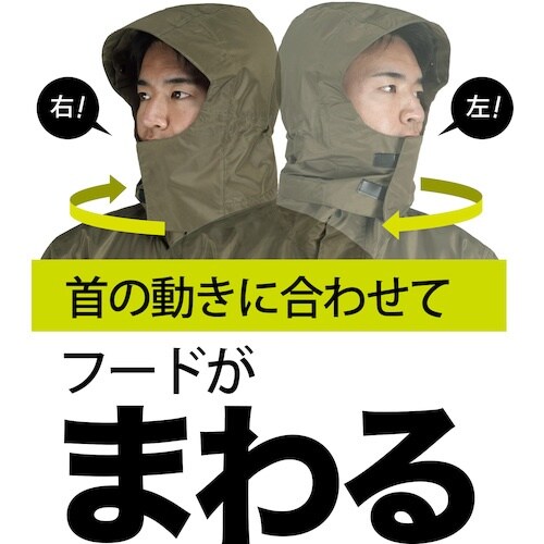 首の動きに合わせてフードが回る回転フードが雨の日の作業中の視界を幅広く確保します。バイザーシステムで顔に水滴が当たるのを軽減でき、メガネの濡れ防止やメイク落ちも防げます。雨天時の野外作業。