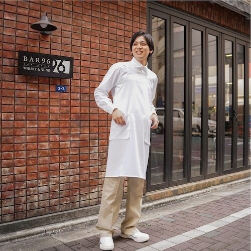 頭から被るだけの簡単ワンステップで着用できるエプロンなのに着崩れなくストレスを感じません。 性別、体型に関係なくどなたでも着用でき、太めの肩ひもはずり落ちの心配もありません。