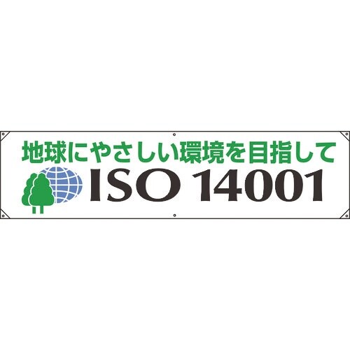 表示内容:ISO14001 地球にやさしい環境を目指して | 取付仕様:穴6ヵ所 | 縦(mm):450 | 横(mm):1800 | ハトメ穴内径(…