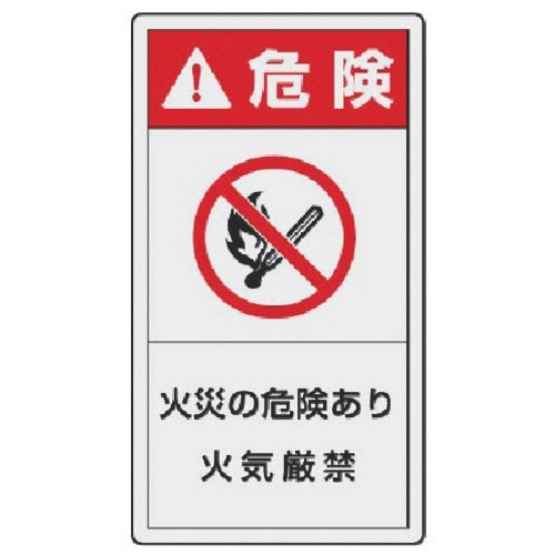 表示内容:危険 火災の危険あり火気厳禁 | 縦(mm):55 | 横(mm):30 | 摘要:耐熱温度・約−40〜60℃、地色・シルバー・粘着シール …