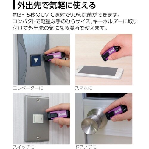 エレベーター等のスイッチ、ドアノブ、スマホ、といった、指先が触れる場所に約3ー5秒のUV−C照射で、安心の99%除菌できます。ミニライト付きなので、夜間作業、アウトドアの方にも便利です。 |
