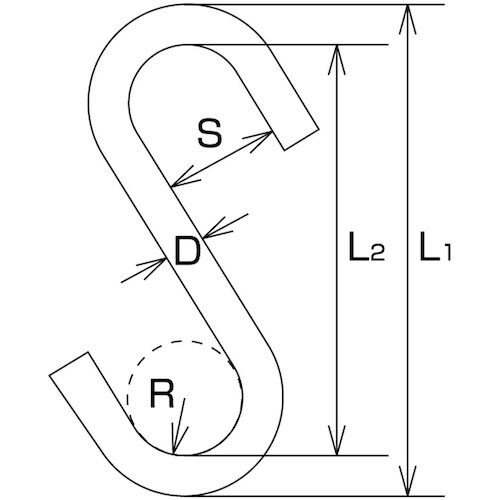 Sの口がほぼ平行に開いているので、幅のある箇所に掛けやすいです。開口部が大きいのでパイプなどに取り付けができます。工具・器具などの一般商品の収納の吊り金具として。