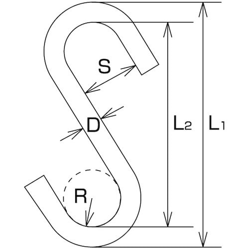 Sの口がほぼ平行に開いているので、幅のある箇所に掛けやすいです。開口部が大きいのでパイプなどに取り付けができます。工具・器具などの一般商品の収納の吊り金具として。 |