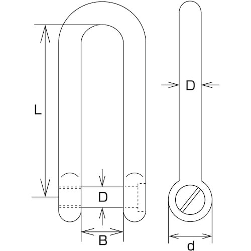 シャックル部が長く用途が広がります。シャックルのピンの出っ張り(摘む部分)を除いているので、ロープなどがひっかかりません。チェーン・ワイヤ・ロープ等の連結金具として、また端末の金具のジョイントに。 |