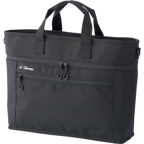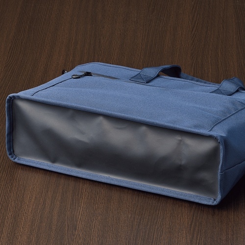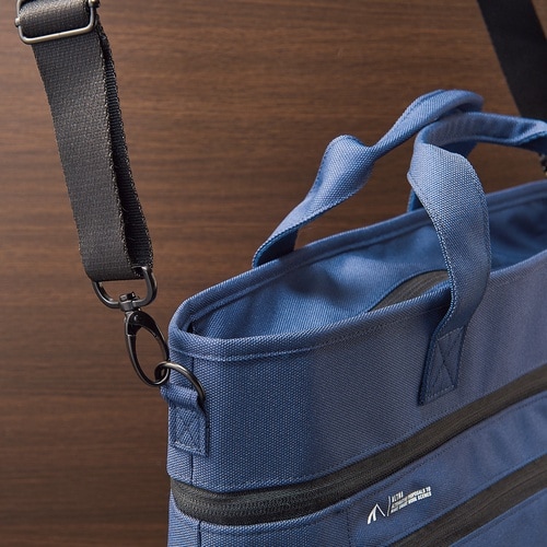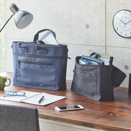 側面から開けば机上で自立するファイルスタンドに。天面のファスナーからも出し入れ可能。前面のファスナーポケットの内側には3連ポケット付き。バッグの内側には2連ポケット付き。 |