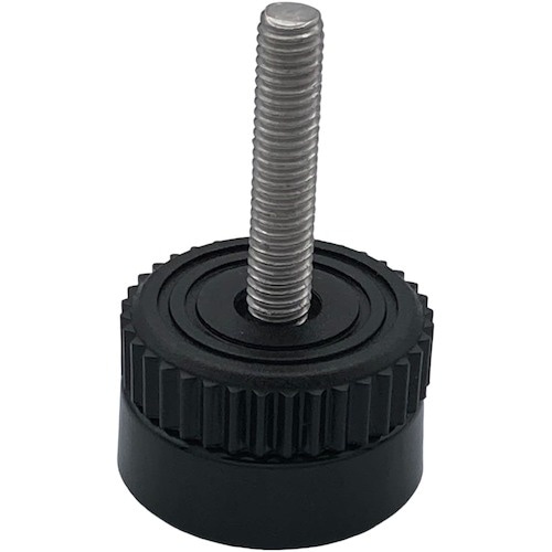台座にピットクッション(滑り止め)シートが付いた小型タイプのアジャスターです。台座とノブが独立回転しますので、相手物をネジ部に取り付けた状態のまま高さ調整が可能です。