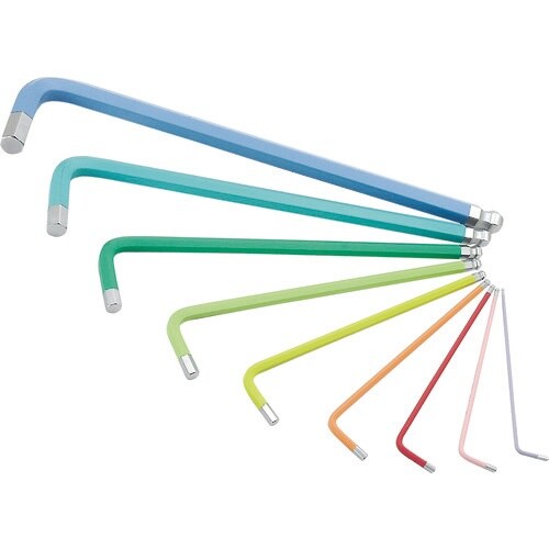 各サイズごとに色分けされており、一目で使用寸法を確認することができます。六角棒の先端平面角は、面取りを行っていますので、六角穴へ差込が容易となっています。
