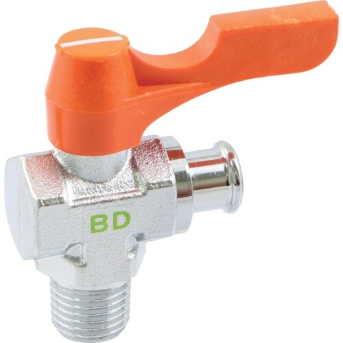ボールバルブと継手の一体化コンパクトな形状です。アングル型です。特有のカラー感覚とデザインは機器の機能と美観を高めます。0.98MPa(80℃ー−10℃)の水、空気、油用です(凍結個所は除く)。