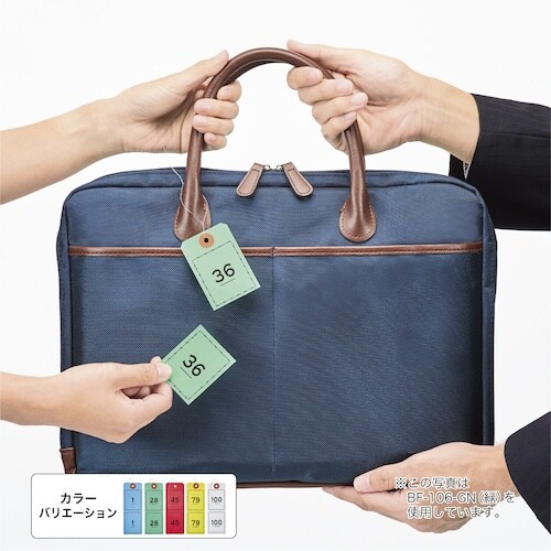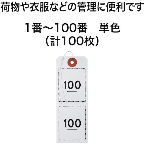 単色パックでお求めやすい。預り物を管理できます。ミシン目が入っており、簡単に切り離せます。1番ー100番までが1組となっています。柔らかい針金であらゆるものに取り付けられます。