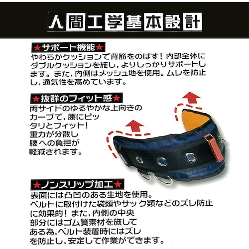 | 注意事項 | ※本サポートベルトは作業中の腰への負担を軽減するものです。腰痛などの治療を目的とするベルトではありません。このベルトは安全帯ではありません。落下防止の目的としてのご使用は絶対にしないでください。またサポートベルトのD型リングには安全帯用のフックは絶対に掛けないでください。 |
