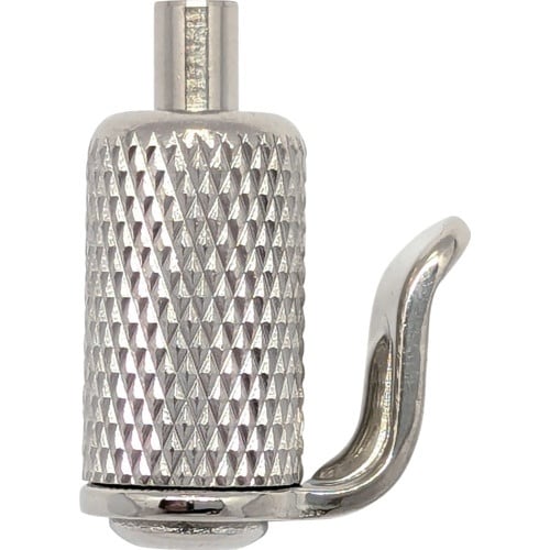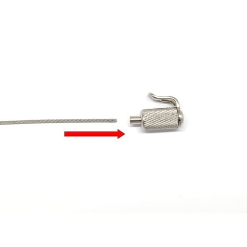 ワイヤーを突起部の方から差し込むだけで止まり、突起部を押し込むとワイヤーを抜くことができます。ワイヤーロープへ取付け後、位置の調整が行えます。ワイヤーとの併用で展示物などの吊り下げに。 |