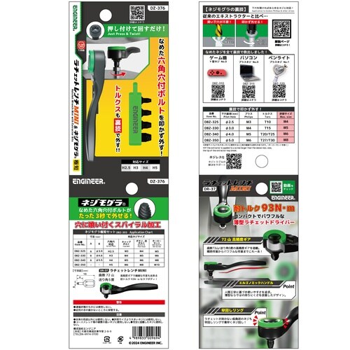 ラチェットレンチMini(DR−37)と潰れた六角穴付ボルトを叩かず外せるネジモグラ極短4本組(DBZ−303)のセット。独自の先端形状により、潰れた六角穴付ボルトを叩かず外せます。 |