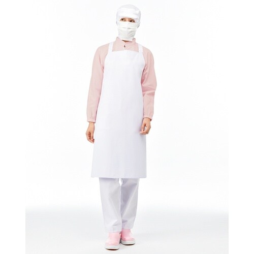 撥水加工付き給食サービス向けノーポケットエプロンです。軽量で着用時のストレスを軽減します。肩紐のズレを防止するために紐の角度、裏側のループ幅にこだわっています。水場作業に。
