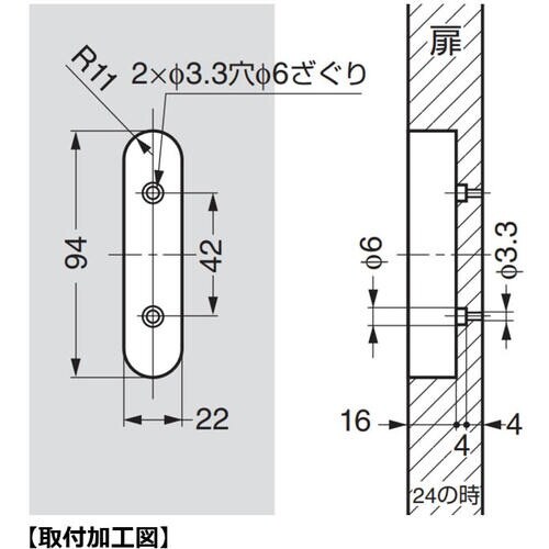 FH−100AK(反転タイプ)は指を離した際レバーが開いた状態を保持し、FH−100BK(復帰タイプ)は指を離した際レバーが自動的に閉じます。扉厚は25mm以上をおすすめします。 |