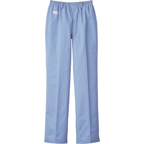 給食サービスにおすすめのストレートパンツです。ウエスト総ゴム、前開き金属ファスナー、右後外ポケット付きです。ホワイト、サックスの2色展開です。 |
